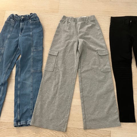 Maastokuvioiset KappAhl housut koko 146, Lab industries farkut, koko 140. Housut ovat kuitenkin lähes samankokoiset.