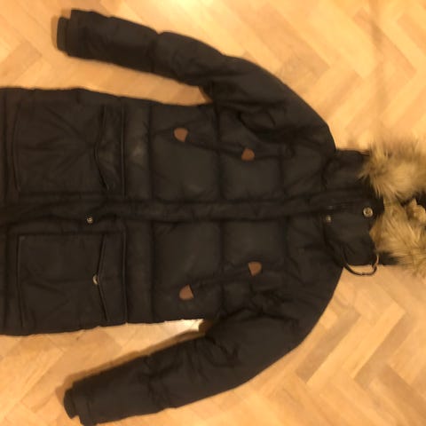Tummansininen, ehjä, erittäin siistikuntoinen ja muhkea sekä lämmin untuvatakki, jossa täytteenä 80% untuvaa ja 20% höyhentä. Ei pesty, ainoastaan sappisaippuan avulla puhdistettu kauluksesta meikkivoiteen jäämiä. Vetoketjulla irrotettava huppu karvareunuksella, joka myös napeilla irrotettavissa. Vyötäröllä sekä alareunassa kuminauhakiristys. Mitta kainalosta takin alaosaan 54cm.