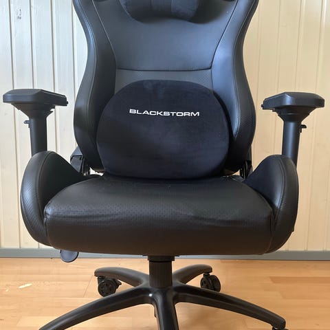 Hyväkuntoinen kangas pelituoli selkänojalla ja niskatyynyllä.