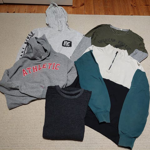 Paitapaketti sisältää kuusi paitaa kokoa 152. Merkkeinä Nike, Cupus, H&M.