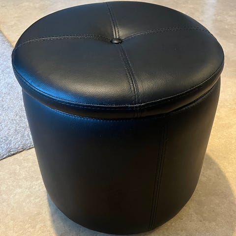 Valkoinen kangaspäällysteinen rahi jossa säilytystilaa sisällä. Muutama tummentuma kankaassa (kuvat.)