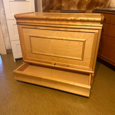 Boknäs kaksi vitriiniä lasiovilla, yläsokkeli ja umpisokkeli.