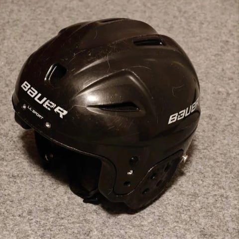 Bauer jääkiekkokypärä, johon sovitettu Kohon kasvosuojus. Sivu rajoittimet puuttuu. Youth s-koko, säädettävä 52-57cm