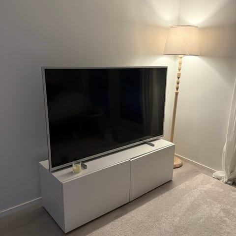 Hyväkuntoinen Bestå tv-taso. Pohjassa lisätuki, takaseinässä ja pöytälevyssä aukko johdoille. Kaapeissa yksi hylly. Pöytälevyn takakulmassa pieni kolhu, muuten virheetön.