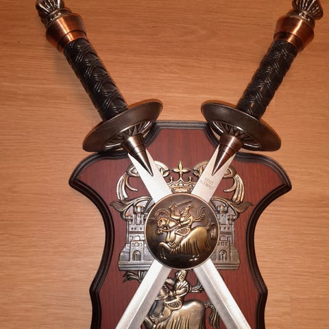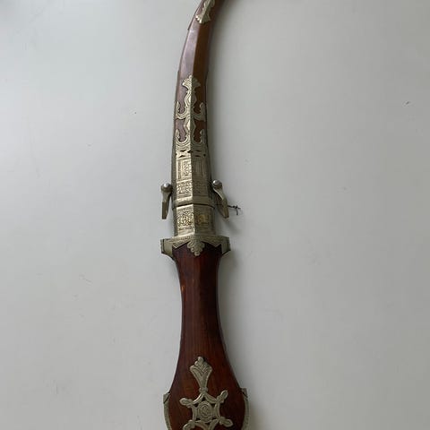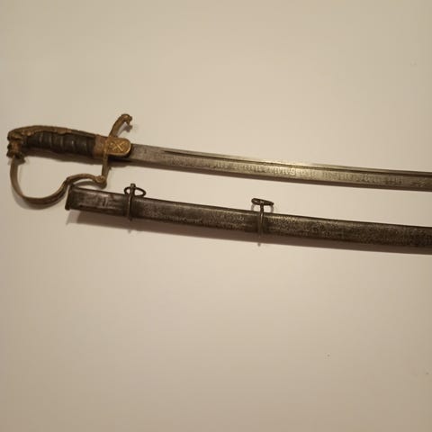 Koristeellinen miekka, jossa on yksityiskohtainen kuviointi terässä. Miekka on asetettu jalustalle.
