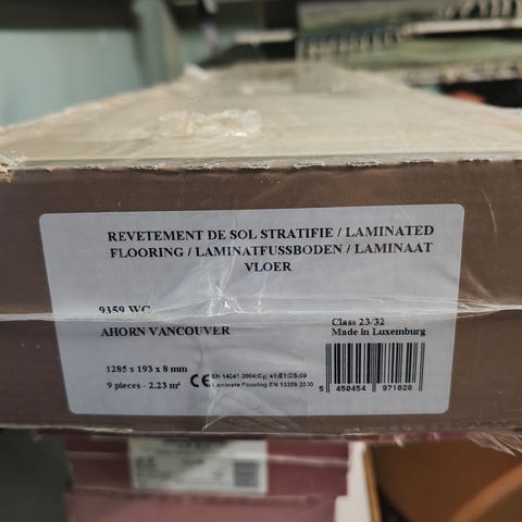 Luxfloor LX 8.5 laminaatti, mitat 1296 x 193 x 8.5 mm. Paketissa 1.98 neliötä. Tätä 4 pakettia