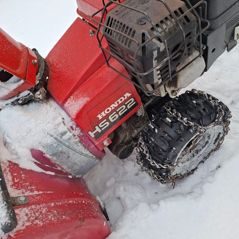 MTD M 61 on lumilinko, jossa on punainen runko ja musta heittotorvi. Laite on varustettu moottorilla ja kahdella renkaalla, jotka helpottavat lumien puhdistamista erilaisilta pinnoilta.