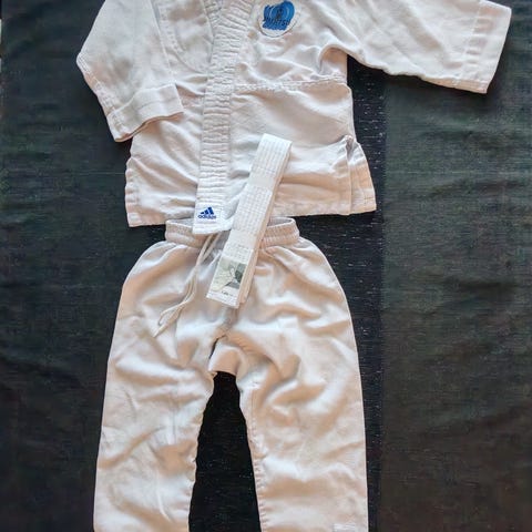 Lasten kamppailuasu kamppailulajeihin, kokomerkintä takissa 120, housuissa 130. Housujen pituus vyötäröstä lahkeen suuhun 76 cm. Asu sisältää valkoisen takin, housut ja vyön. Materiaali puuvillaa. Soveltuu lapsille kamppailulajien harjoitteluun.