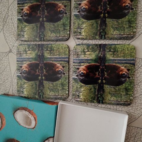 Myyn 6 kpl lasinalusia, joissa suloisia karhun kuvia suomalaisessa metsämaisemassa.
