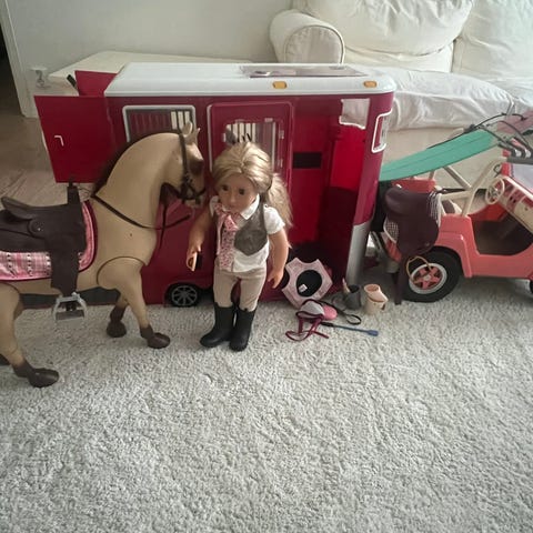 Our generation hevostraileri ja tarvikkeet. Ilmeisesti trailerin kiinnitys autoon on rikki. Hinta 10 euroa.