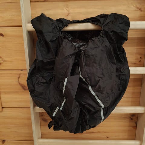 Päällä vetoketju, alareunan kiertää kuminauha ja kuomuosan takana on kaksi pitkää tarranauhaa helpottamassa rattaisiin kiinnittämistä.