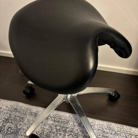 Hyväkuntoinen satulatuoli. Istuinkorkeus 60-85 cm eli sopii korkeankin pöydän ääressä työskentelyyn. Vain nouto Olarista.