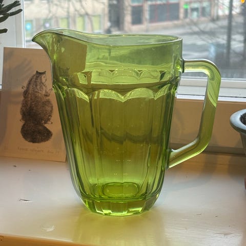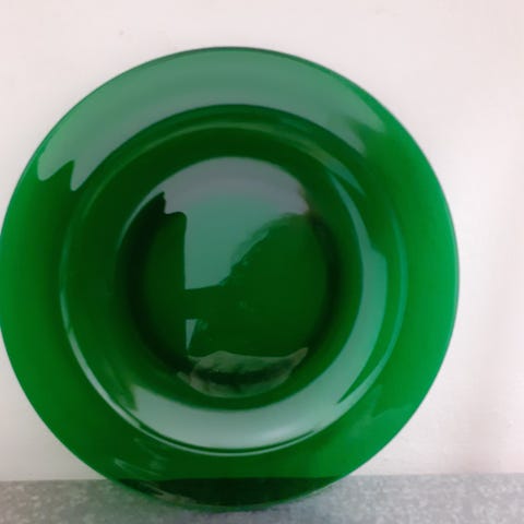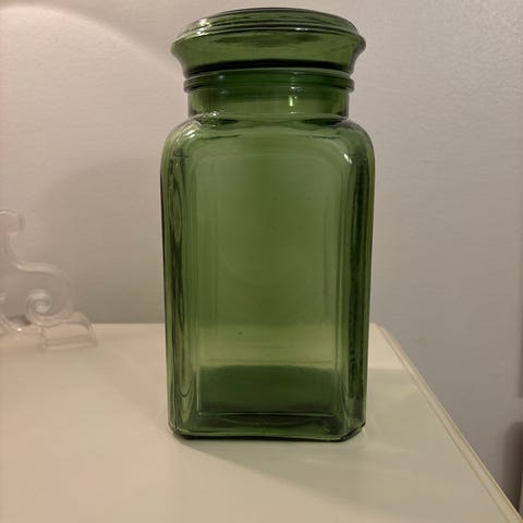 Vanha vihreä korkilla oleva säilytysastia. Täysin ehjä. Korkeus 15.5 cm.
