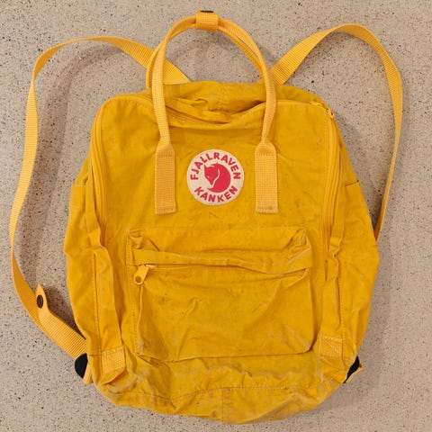 Fjällräven Kånken reppu, ei ihan mini mut ei erityisen isokaan, eli varmaan ihan normikoko.