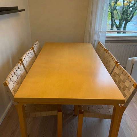 Myydään hyväkuntoinen Artek 83 pöytä sävyssä koivu/valkoinen sekä 6kpl satulavyötuoleja 611 luonnonvärisenä. Käytettyjä, mutta hyväkuntoinen setti uuteen kotiin.