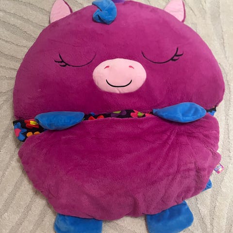 Happy Nappers ei ole kuten mikä tahansa pörröinen pehmohahmo, vaan se toimii avattuna myös makuupussi tai peittona! Ihanan pehmeä hahmo on niin rutistettavan suloinen, ettei sitä pysty kukaan vastustamaan. Suloinen yksisarvispehmotyyny avautuu mukavaksi, 167 cm pitkäksi makuupussiksi. Makuupussi sopii noin 5-vuotiaille ja sitä vanhemmille lapsille.