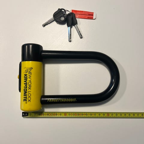 Kryptonite U-lukko, jossa on pitkä musta kaari ja punainen lukon runko. Lukko soveltuu polkupyörän tai muun vastaavan kohteen lukitsemiseen.