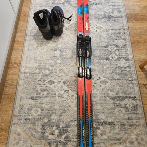 Sukset ja monot nnn. Rossignolin siteet. Kuvassa näkyy, että naarmuja pohjassa mutta menee kyllä esim. Koulun liikunta tunneilla hyvin vielä.