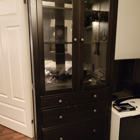 Ikea Hemnesin kylpyhuoneen massiivipuinen kaappi/lasivitriini. Suht painava eli ei ihan mene yksin kuljetettuna.