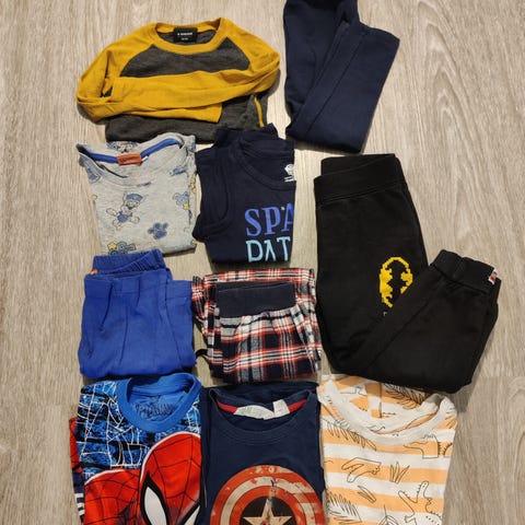 Mielestäni aivan siistikuntoisia käyttöpuseroita koossa 98, 98/104 ja 104. Kaikki olleet suunnilleen yhtä aikaa käytössä. 12 trikoopaitaa ja yksi paksumpi kauluspaita. Merkit mm hm, Lindex, ciraf, lupilu.