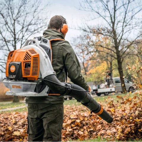Stihl BR 500 selkäpuhallin on varustettu tehokkaalla moottorilla ja ergonomisella selkätuen rakenteella. Laite on suunniteltu lehtien ja roskien puhallukseen ulkona.