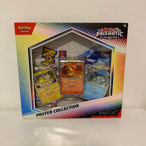Pokémon Prismatic Evolution keräilykorttipaketti, sisältää useita kortteja Pokémon Trading Card Game -sarjasta. Kortit ovat osa Prismatic Evolution -lisäosaa, joka sisältää erilaisia Pokémon-hahmoja ja erikoiskortteja. Paketti soveltuu Pokémon-korttipelin pelaajille ja keräilijöille.