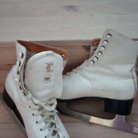 Valkoiset luistimet, koko 38. Luistimissa on mustat korot ja terät.