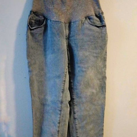 Ihanat äitiysfarkut, lappuhaalarit. Ollut käytössä M-kokoisella. Lyhennetty siten, että sauman saa purettua takaisin L-pituuteen. Nyt pesemättömänä turhien pesujen välttämiseksi, halutessa voin pestä ennen lähetystä. Mmm.