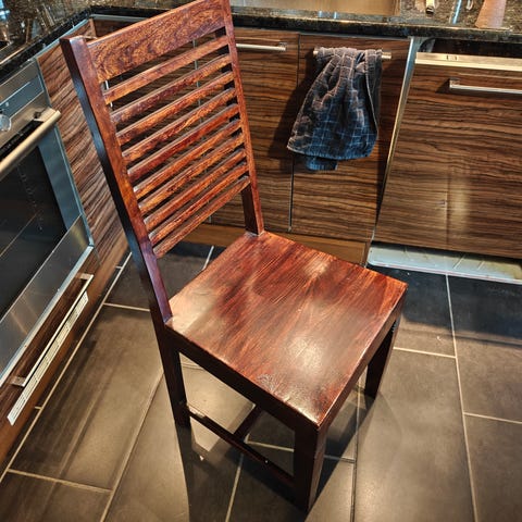Kuvasta näkee koon. Neljä samanlaista käytössä ollutta tuolia. Yhteensä 10e, erikseen 4e.