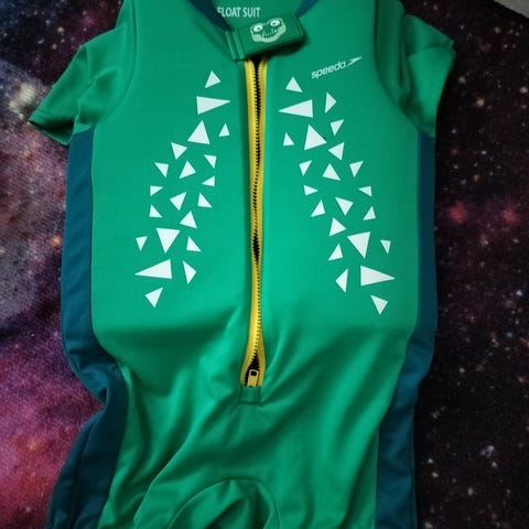 Speedo kelluntapuku, koko 2-3 vuotta (15-18 kg) Sopii mielestäni pienemmällekin lapselle. Lyhythihainen ja lyhytlahkeinen malli, jossa vetoketju edessä. Soveltuu uintiharjoitteluun ja vesileikkeihin lapsille.