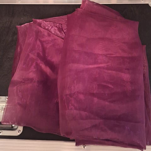 Ohutta, läpikuultavaa materiaalia. Yläosa valkoinen, ja alaosaan mennessä muuttuu violetiksi. Hyväkuntoiset. Yläreunassa tankokuja.