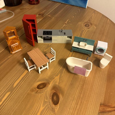 Lasten leikkihuonekalut koko nukkekodin sisustukseen. Sisältää erilaisia miniatyyrikalusteita, kuten sohvan, sängyn, pöytiä, tuoleja ja kodin tekstiilejä. Kalusteet on valmistettu useista materiaaleista ja ne soveltuvat lasten leikkeihin ja nukketaloihin.