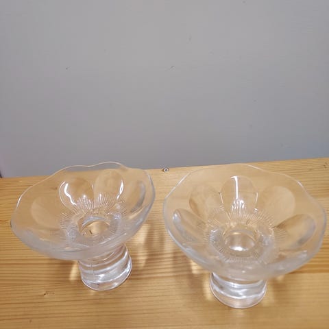 Käyttämättömät kynttilänjalat, 2 kpl, alkuperäispakkauksessa. Korkeus 7,5 cm, halkaisija 9 cm.