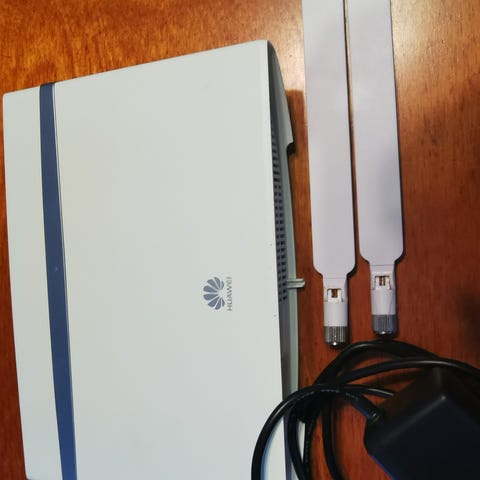 Huawei HG255s reititin, valkoinen väri. Laite on varustettu useilla Ethernet-portilla ja tukee langatonta verkkoa (WiFi). Soveltuu kotikäyttöön tai pieniin toimistoihin verkon jakamiseen.