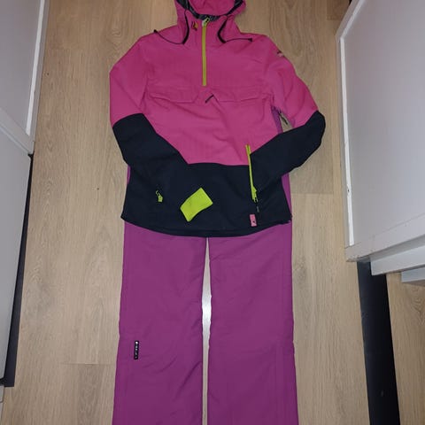 Settiin kuuluu valkoinen kuoritakki + violetit kuorihousut henkseleillä.