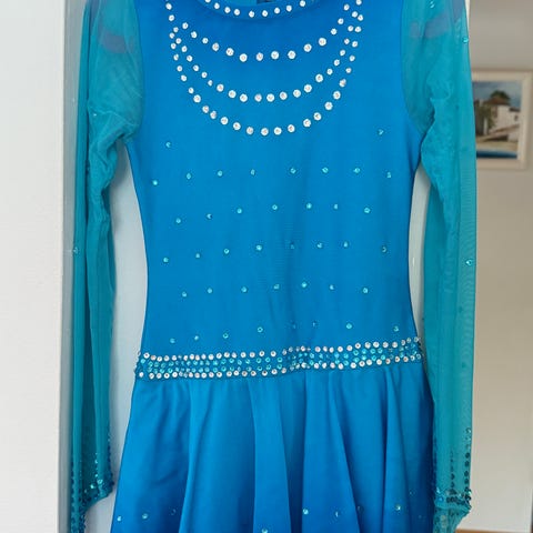 Myydään punainen mustilla pitsikoristeilla koristeltu luistelupuku. Puvussa on lyhyet hihat, avoin selkä sekä hameen alareunassa musta koriste. Soveltuu taitoluisteluun kisapuvuksi. Puvun on suunnitellut ja tehnyt Altejee Titta Kettunen.