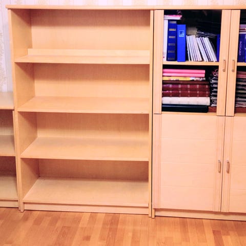 Petsattu massiivikoivuhylly kolmella hyllynkannattimella, jotka hyllyssä edelleen kiinni.
