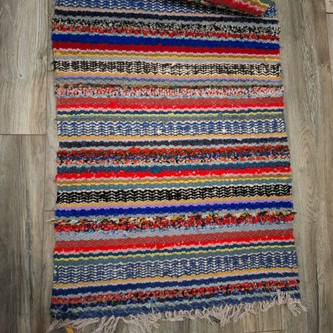 Pehmeä matto, jossa hapsuja. Pohja tiivistä puuvillaa, ns. räsymatto. Ehjä ja siisti, ollut lastenhuoneessa. Boucherouite-tyylinen hillityssä värissä. Nouto Porista 👍