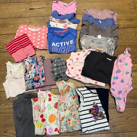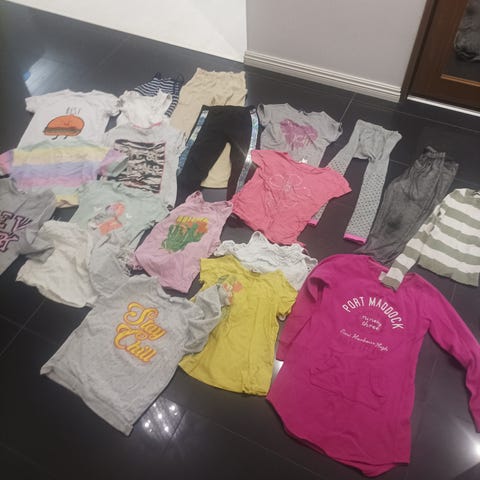 Hyväkuntoiset paidat ja yhdet housut. Pieniä tahroja voi olla.