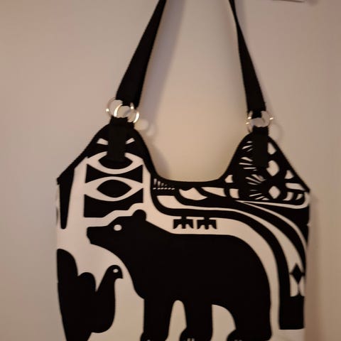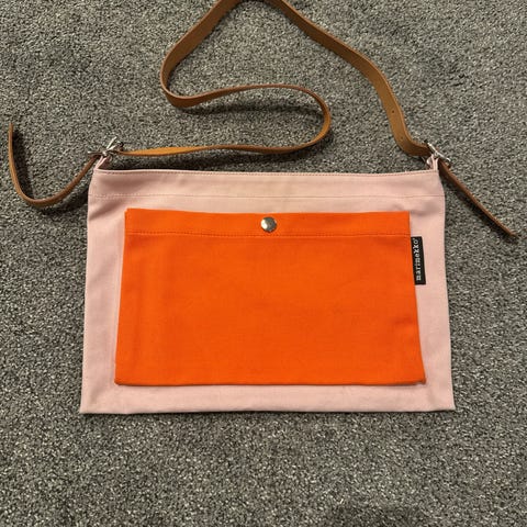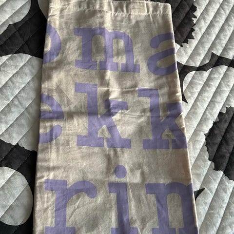 Marimekko kangaslaukku. Pieni olkalaukku, jossa kirkkaanvärinen kukkakuosi. Materiaalina kangas. Sopii pienten esineiden kantamiseen.