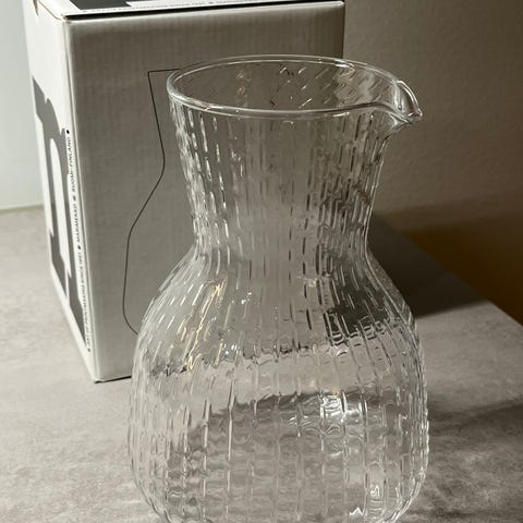 Myydään uusi, lahjaksi saatu, itselle tarpeeton Marimekon kirkas Syksy-lasikarahvi. Tilavuus 1,3 litraa. Suupuhallettua lasia, kaunis teksturoitu pinta.