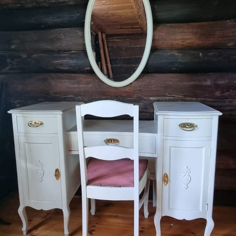 Vanha meikkipöytä, peili, 2x tuoli ja 2x yöpöytä
