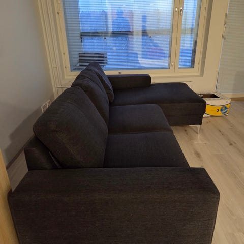Harmaa kulmasohva, jossa on vuode- ja säilytystila. Sohva muuntuu helposti vuoteeksi ja säilytystila on kätevästi sijoitettu. Sopii olohuoneeseen tai muuhun oleskelutilaan.