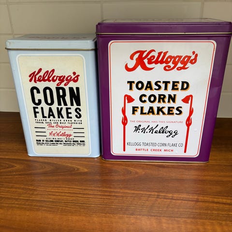 Siistikuntoinen vaaleanpunainen Kelloggs peltinen, vintage tyylinen säilytyspurlkki. Korkeus 23 cm, leveys 18 cm.