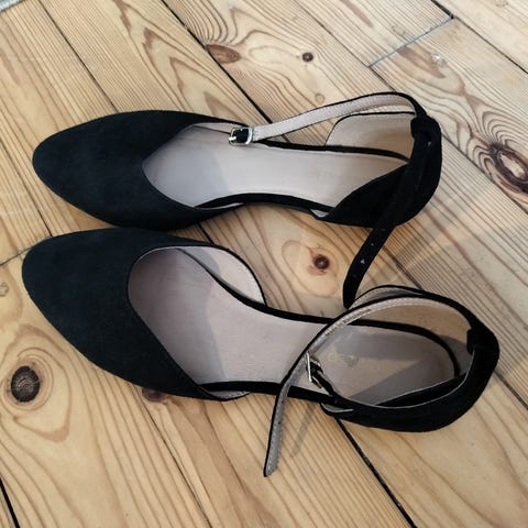 Red Shoe-merkkiset juhlakengät, koko 40, mustaa nahkaa. Kengissä on korkeat korot (8cm) ja nilkkaremmi.