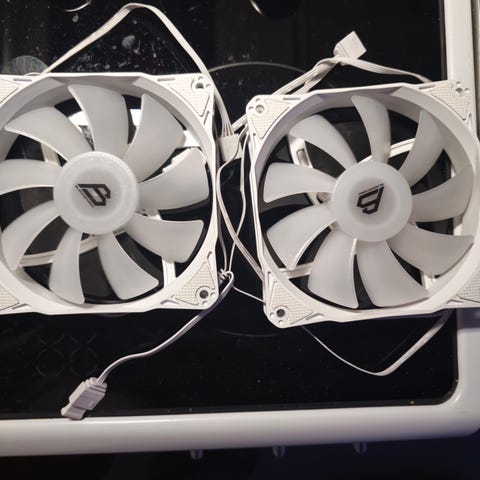 2kpl Alphacool Rise Aurora 120mm PWM RGB tuulettimet. Toisen tuulettimet RGB liitin purettu koska valaistusta ohjattu Arduinolla.