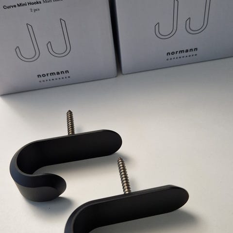 Kerran seinässä olleet Norman Copenhagen Drops seinäkoukut (2kpl) pyyhkeille tms. Siististi irroitettu, toisessa pieni nirhaisu seinää vasten olevalla puolella (näkyy kuvissa). Ei näy ulospäin ollenkaan.