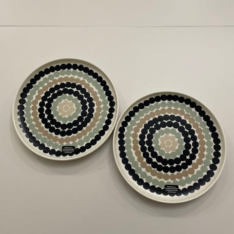 Marimekon 25 cm halkaisijaltaan ruokalautaset. Oiva Siirtolapuutarha. Olleet muutaman kerran käytössä, ei käytönjälkiä. 2 kpl yhteensä 40€.