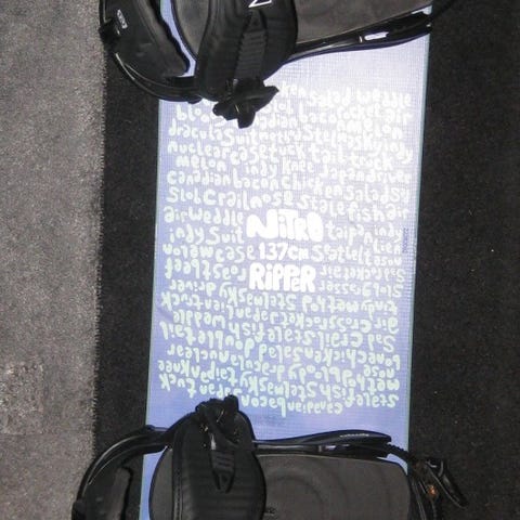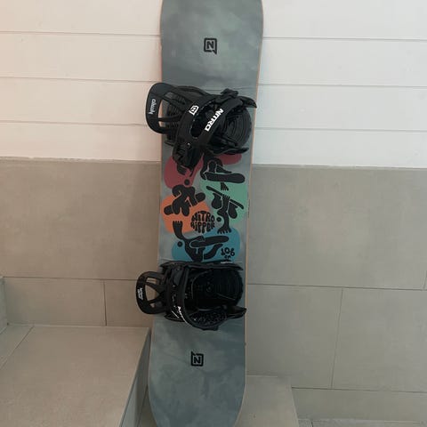 Todella hyvässä kunnossa oleva Nitro Spirit 106 cm lumilauta ja Charger micro siteet.