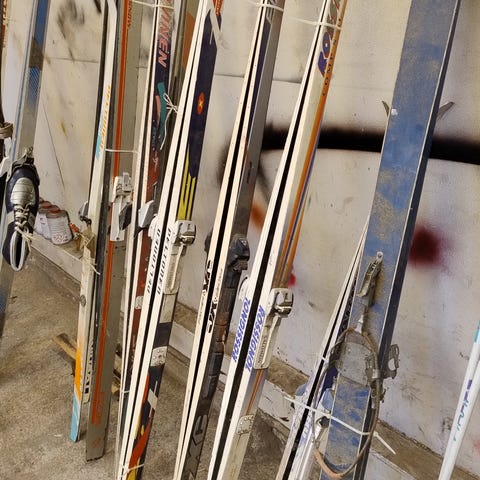 Ensisukset. Kenkiin kiinnitettävät sukset 80cm ja sauvat 60cm.